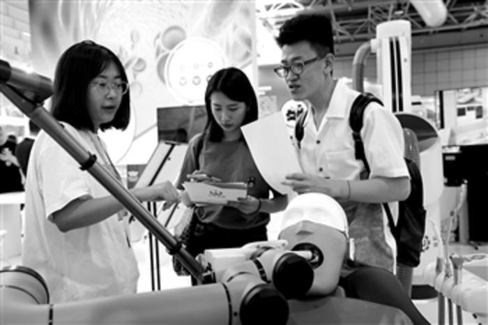 6月13日,几位参观者在参观展出的口腔临床微机器人手术系统。当日,全国大众创业万众创新活动周——北京会场主题展在中关村国家自主创新示范区展示中心开幕,参展企业300余家,项目300余项。新华社记者 鞠焕宗 摄