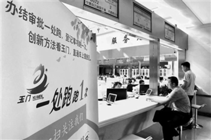 在甘肃省玉门市民中心服务大厅,市民在窗口办理业务(2018年8月17日摄)。2017年以来,甘肃省玉门市不断深化“放管服”改革,推行“一窗办一网办简化办马上办”,基本实现群众、企业办事只往市民中心服务大厅一处跑,跑一次就能办结所有审批和服务事项。 新华社记者 范培珅 摄
