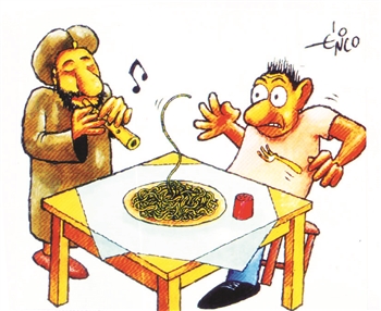 就餐者眼睁睁看着盘中的面条翩翩起舞, 在诧异中,忽见一旁的玩蛇人在操弄把戏。真是神奇的人,更怪的是诡谲的魔笛!【巴西】亚利斯