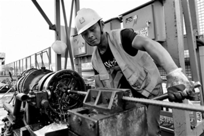 6月16日,在济南裴家营城中村改造村民安置用房项目现场,钢筋工孙式宽冒着酷暑施工。当日,山东省气象台继续发布高温黄色预警信号,施工人员顶着烈日高温,加紧建设,确保项目按时交付。新华社记者 朱峥 摄