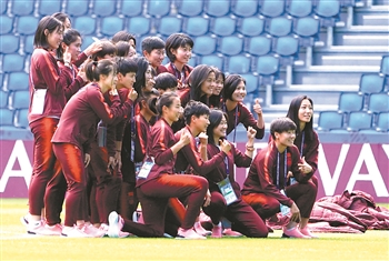 6月16日,中国女足队员在踩场完毕后合影留念。