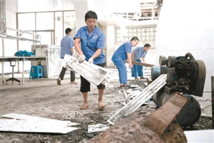 今天下午,《工人日报》记者在宜宾建国酒厂看到,职工正用水泵将坛里的酒抽送到厂区南侧的不锈钢酒罐里。而在厂区另一处受损比较严重的地方,职工正在排除隐患,清理垃圾。