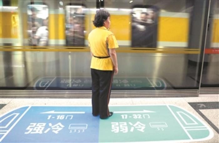 6月19日,北京地铁6号线,乘客可根据地面上车厢温度提示标识按需乘车。