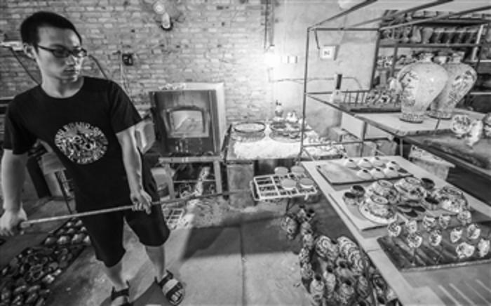 6月18日,景县龙华镇手工艺人从电炉中取出烧制好的铜胎画珐琅半成品。