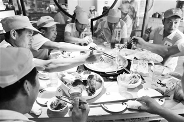 6月16日中午,西安,陕西明堂环卫股份有限公司碑林区分公司40多名环卫工一起来到火锅店,吃了一顿父亲节免费的火锅。