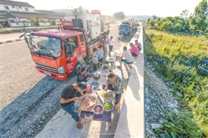 6月20日傍晚,大伙儿在车队旁边生火做饭。由于在外吃饭又贵又不合口味,只要有时间,他们都会自己买菜自己做,米是自己带的。