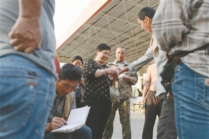6月3日傍晚,收割队利用加油的时间聚在一起,平分当天收到的酬劳。