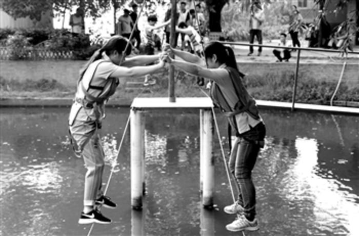 6月21日,江苏大明集团员工展示团队协作的生死与共项目。