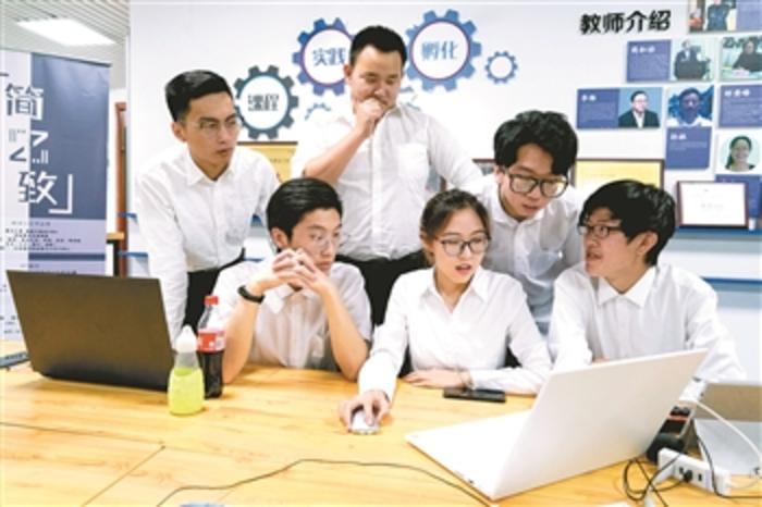 图为6月26日,在北京市贯通培养试验项目试点高职院校——北京财贸职业学院,参与贯通培养试验项目的2015级国际金融专业学生季心雨(前中)与创业团队成员一起讨论项目进展情况。 新华社记者 沈伯韩 摄