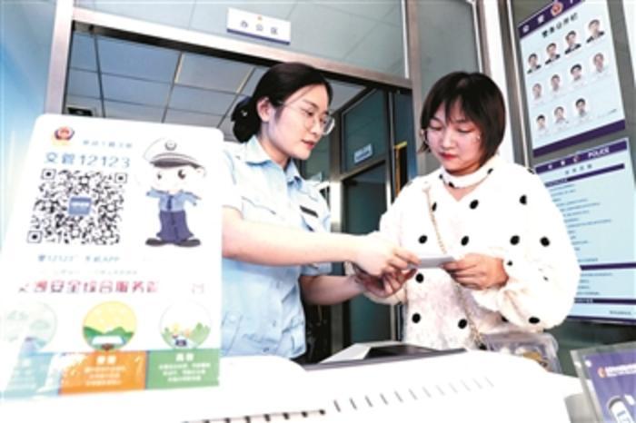6月26日,在天通苑派出所巡逻警务站车管服务点,工作人员(左)帮助来办理业务的市民填写表格。