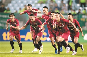 6月26日,在韩国全州举行的2019亚洲足球冠军联赛八分之一决赛第二回合比赛中,中超上海上港队客场对阵韩国全北现代队。两队经90分钟战成1比1,总比分2比2,经加时赛仍未决出胜负。最终,上海上港队在点球大战中以5比3战胜对手,以总比分7比5战胜全北现代队,晋级八强。上海上港队球员庆祝胜利。 新华社发(李相浩摄)