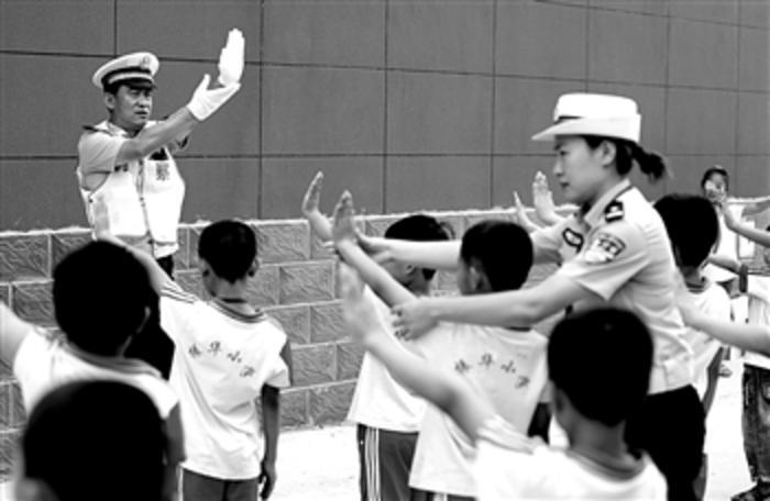 6月27日,衡水市交警二大队民警指导振华小学学生学习交通手势。