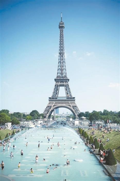 6月26日,在法国巴黎,人们在特罗卡德罗公园喷泉池消暑。