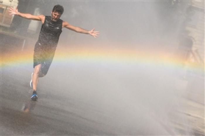 6月26日,一名男子在奥地利维也纳施瓦岑贝格广场戏水消暑。