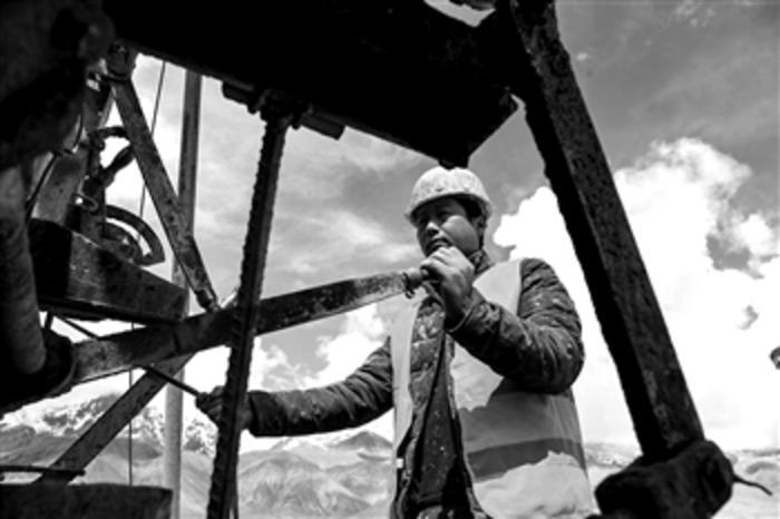 参与中巴公路新疆布伦口至红其拉甫段改扩建工程的施工人员展克宁在操作钻机(6月13日摄)。