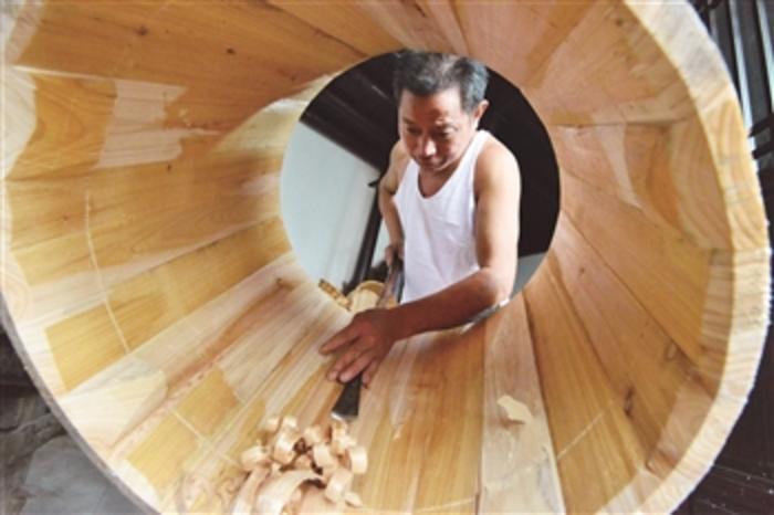 “1980年,我从农村回到了县城,没有单位,就在老街重操旧业,做圆木一直到现在。”老杨说,现在虽然电饭煲、塑料桶、塑料盆代替了不少圆木制品,但是新的需求不断出现,市场上饭店的饭甑、泡脚的木桶,需求量依然很大,让他的活都接不过来,每天都要加班到晚上10点多钟。