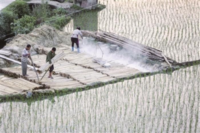 图为 6月26日,在隆回县滩头镇桃林村,李秋桂(中)和父母在料凼里劳作。