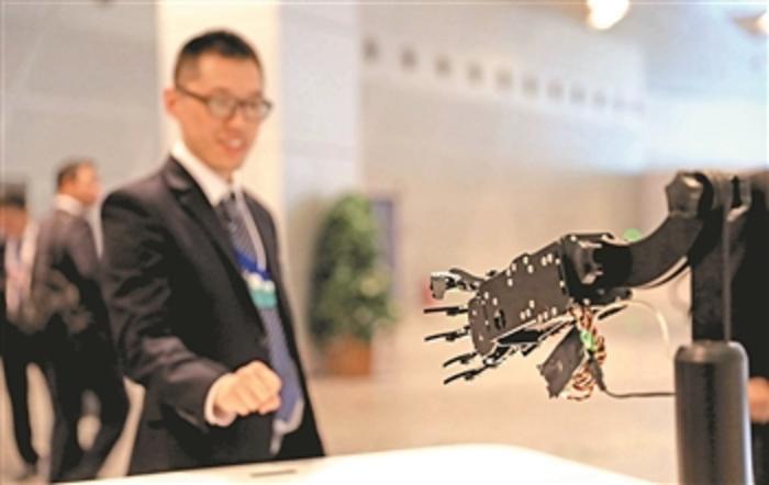 世界经济论坛第十三届新领军者年会(夏季达沃斯论坛)7月1日至3日在辽宁大连举行。会场上,手术机器人、5G智能沙箱、生物识别技术等科技感十足的展示项目吸引了众多与会者参观体验。图为参会嘉宾体验“猜拳”机器人。新华社记者 杨青 摄