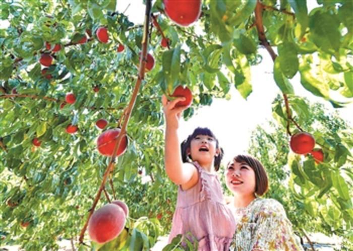 7月1日,游客在滦州市九百户镇九百户村鸡冠山生态农业产业园摘桃。