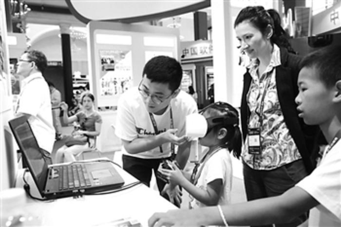 6月29日北京展览馆,热爱编程的小朋友正在体验利用VR技术测试视觉障碍。6月28日,2019第二十三届中国国际软件博览会在京开幕。展会吸引了来自30多个国家、100多个地方省市、超过400家企业和机构的院士、专家、企业代表和国际友人参会。本报记者 刘金梦 摄