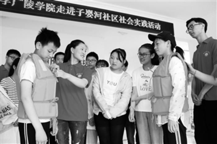 7月2日,扬州大学广陵学院大学生志愿者为宝应县子婴河社区留守儿童讲解救生衣的使用方法。