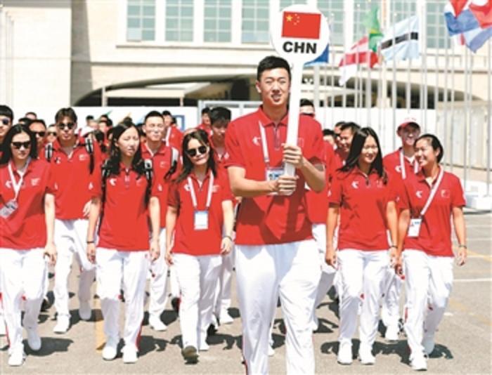 当日,参加第30届世界大学生运动会的中国大学生体育代表团部分成员在那不勒斯海港升旗广场举行升旗仪式。