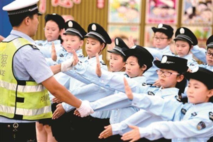 图为7月4日,在河北沧州市运河区文庙社区与沧州交警一大队合办的“交通安全教育公益课堂”上,孩子们学习交通指挥知识。
