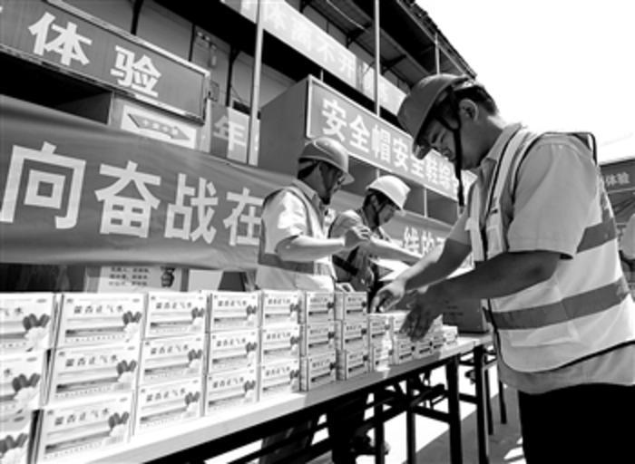 7月4日,工作人员在摆放防暑药品,准备发放给建筑工人。