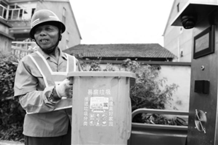 7月4日,在浙江省德清县乾元镇的卫星村,易腐垃圾清运员丁掌良在介绍安装智能芯片的垃圾桶和能称重并上传垃圾分类信息的机器。2019年以来,浙江省德清县乾元镇坚持垃圾全程分类,完善生活垃圾分类投放、分类收集、分类运输、分类处置的全链条管理制度。新华社记者 林善传 摄