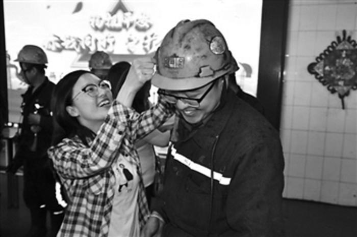 图为一名矿工妻子在为丈夫系上象征吉祥的红绳。