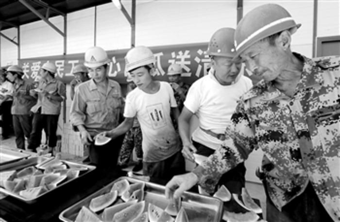 7月5日,湖北省襄阳市庞公北还建房项目工人们吃爱心扶贫西瓜降暑。当日,中建三局、中交二航局、南通六建三家企业到襄阳市南漳县李庙镇东沟村购买6万元扶贫西瓜,免费送给工地农民工,既解决了农村西瓜销售难,也给夏季工人解酷暑。