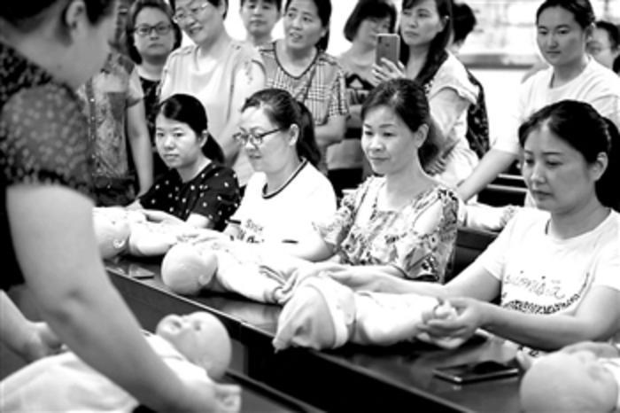 7月9日,妇女学员在学习新生儿护理知识。为提升辖区妇女的创业、就业技能,安徽省合肥市南七街道丁岗社区结合市场需求开设“妇女创业学院”,免费为有创业、就业需求的妇女提供家政、面点、电商等技能培训。新华社记者 刘军喜 摄