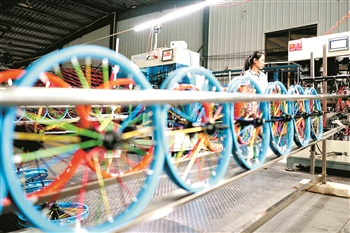 图为7月9日,河北省广宗县一家自行车生产企业的员工在轮圈生产线上工作。
