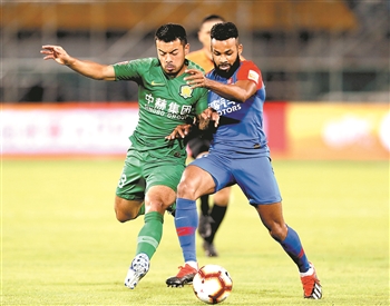 7月10日,北京中赫国安队球员李可(左)与重庆斯威队球员费尔南迪尼奥在比赛中拼抢。