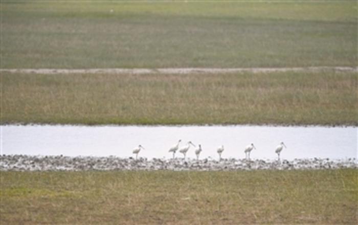 6月27日,江苏盐城东部沿海的大丰麋鹿国家级自然保护区,一群黑脸琵鹭在水边栖息。 新华社记者 李响 摄