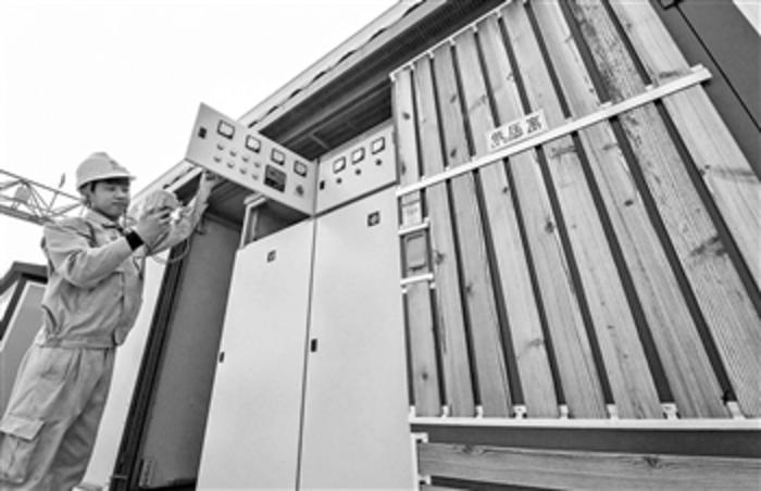 7月12日,河北省文安县德归镇一家输变电设备制造有限公司的工人在检测低压室内变电设备。