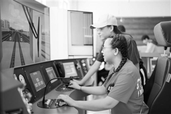 7月11日,市民在轨道交通实操室通过模拟系统感受高铁驾驶。