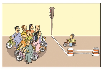 不好意思再说下去了。事实上,这件作品何止仅仅批评行人。行走于人生,行走于职场,行走于官场,处处都会遇到各种红绿灯。该停下脚步时,就不要再做其他盘算。讽刺漫画嘲讽的现象,大多出自不守规矩或破坏秩序。