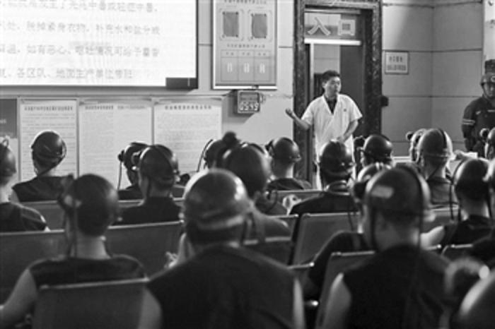 图为该公司卫生所工作人员为等待下井职工宣讲防暑知识。张超 张继涛 摄