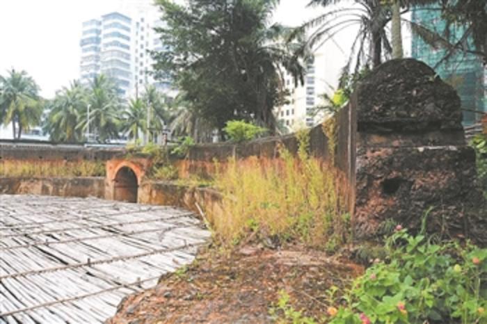 6月27日,记者在现场看到,镇琼炮台遗址被建筑工地围挡包围着,仅有一处铁皮门可以出入。镇琼炮台遗址内已荒草丛生,积水成黑塘,昔日炮位成菜地,“海口市文物保护单位”石碑淹没在荒草中。这是一处圆形露天炮台,炮台四周围墙环抱。当年的“红毛泥”(水泥)现在黑如炭。爬上墙垣一看,里面是浑水和竹板,毫无炮台踪迹。
