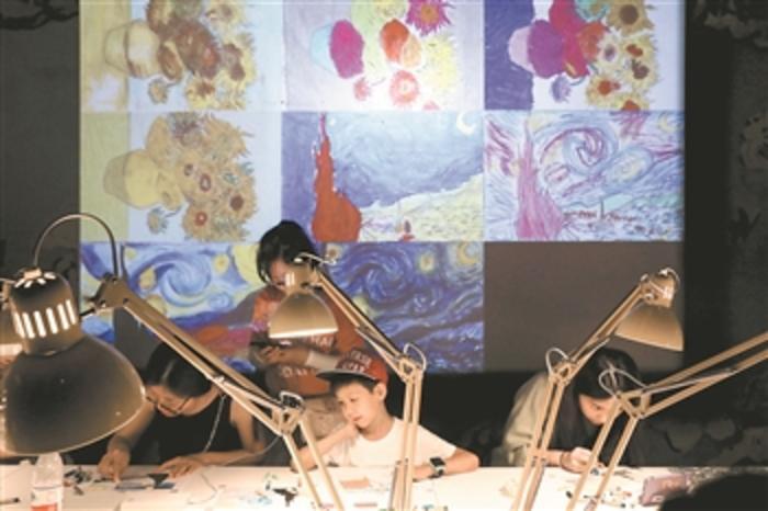 6月25日,中国国家博物馆“心灵的畅想——梵高艺术沉浸式体验”现场,观众在用蜡笔填色梵高的画作。 本报记者 刘金梦 摄