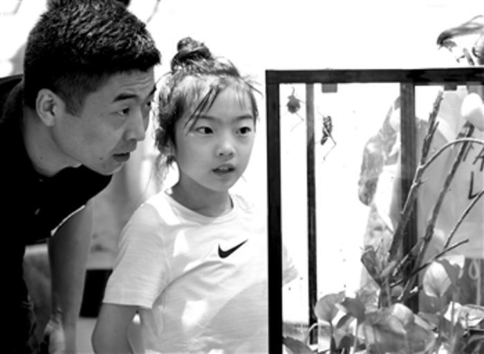 7月14日,家长和孩子在昆虫科普教育展上一起观察活体昆虫。