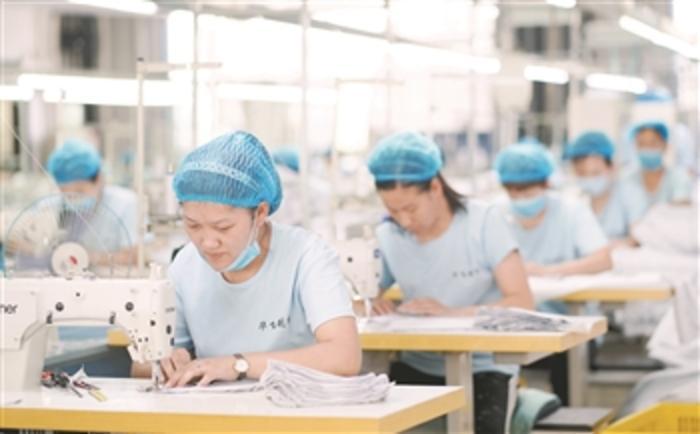 7月11日,在河北内丘工业园区一家制衣企业,当地妇女在生产车间加工服装。