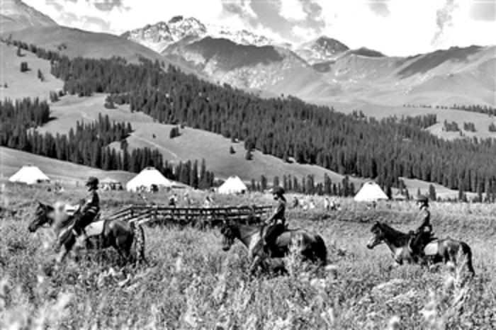 7月15日,新疆那拉提景区空中草原,3位女骑警在景区内骑马巡逻,成为景区一道亮丽的风景。据介绍,该女子骑警队成立于1年前,由12名哈萨克族大学毕业生组成,主要负责景区各个主要路段、人员密集场所的日常巡逻等。刘新 摄/中新社