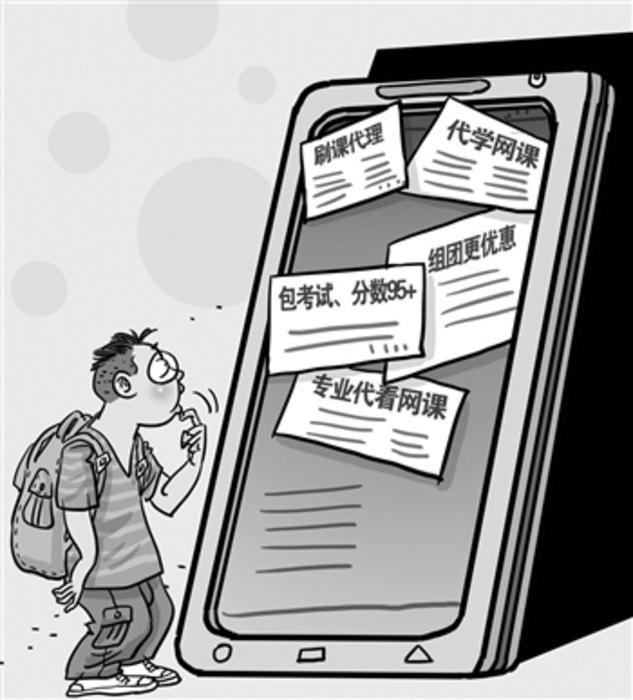 据《中国青年报》报道,随着网络选修课的普及,“代刷”网课的一条龙服务产业链也在悄然兴起。只需花一二十元,给对方提供在线课程的登录账号和密码,从上课到考试全程不用管,就能轻松拿到高分。