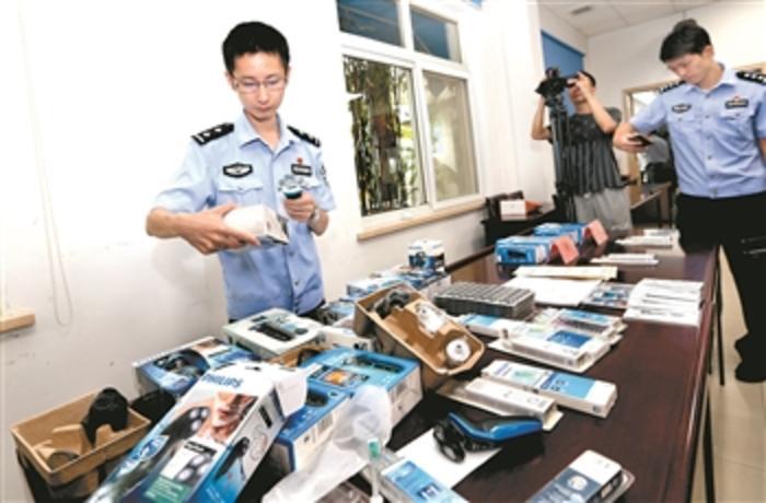 7月17日,上海市公安局青浦分局民警徐伟(左)向媒体展示收缴的部分假冒产品。