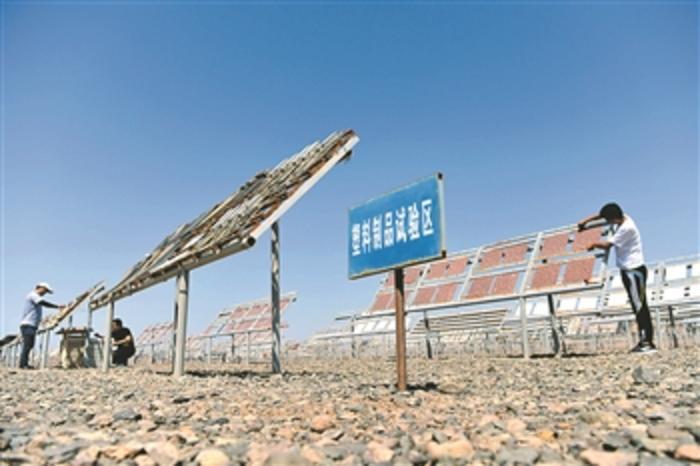 7月17日,在新疆吐鲁番自然环境试验研究中心,检测人员在塑料制品试验区投试待测样品。