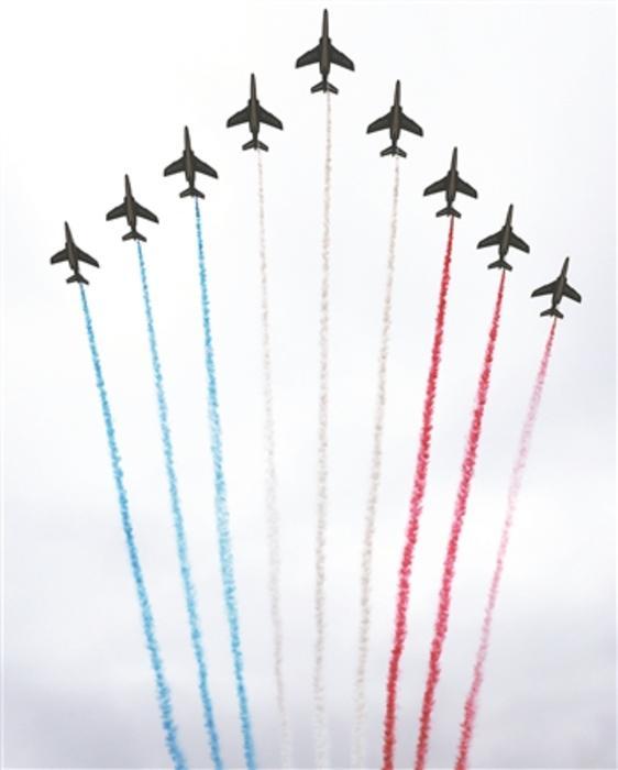 这是7月14日在法国巴黎举行的国庆阅兵仪式上拍摄的“法兰西巡逻兵”飞行表演队。 新华社记者 高静 摄