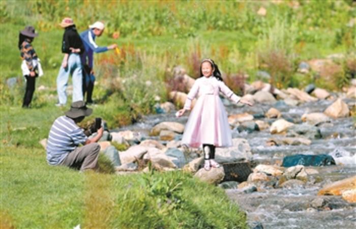 图为游人在达东村景区小溪边玩耍(7月20日摄)。