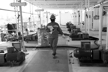 图为70547钻井队泥浆工热依扎·阿达勒“全副武装”从泥浆罐前走过。 周建玲 摄